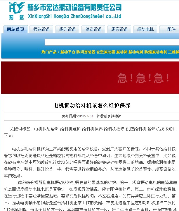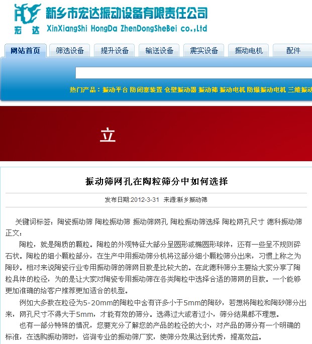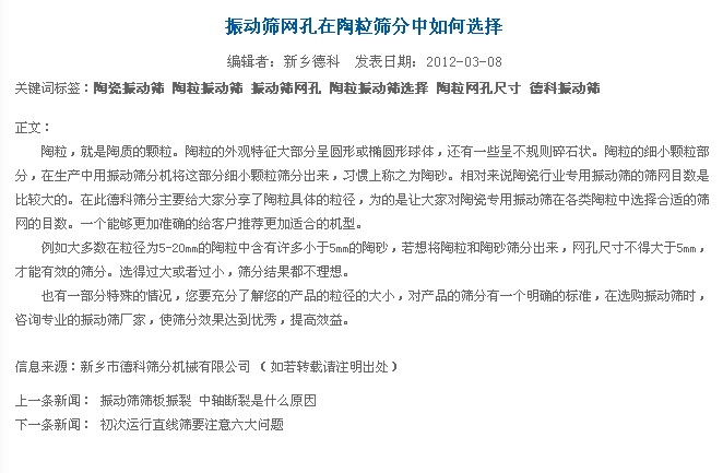 悲劇的全抄襲發(fā)生在2012年3月31日,由宏達振動在其公司網(wǎng)站下發(fā)表同樣名稱的新聞,請看關鍵詞,赫然的德科篩分作為了他們新聞的關鍵詞。正文中提到“在此德科篩分主要給大家分享了陶粒具體的粒徑”,請看宏達網(wǎng)站的截圖。這種抄襲太拙劣了,毫無自己的思維。同日,低劣的全抄襲不僅僅為這一篇。德科不反對技術分享,但請在您分享的基礎上尊重自己和同行。